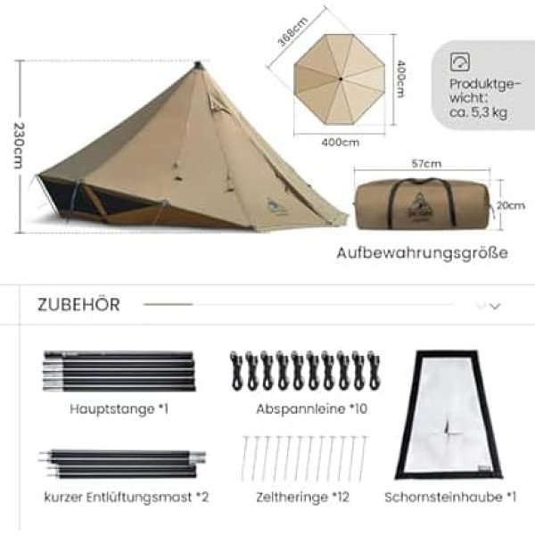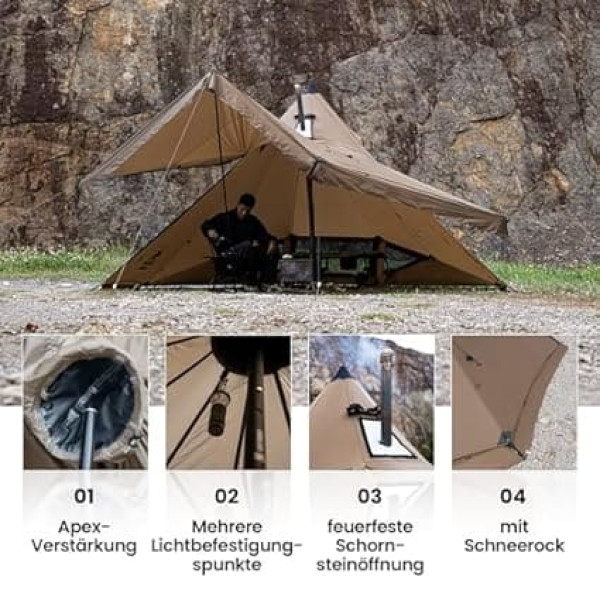 OneTigris Gastropod Teepee Tent 3-6 People 4 Seasons Tent with Oven Hole Ridge Tent Pyramid Tent Waterproof 3000 mm for Camping Outdoor Families