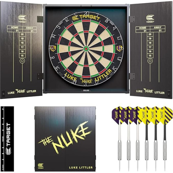 Target Darts Luke Littler Cabinet & Dartboard Set | Player Edition 'The Nuke' Dart Board Cabinet Set with 2 Sets Steel Darts, Score Charts | Professional Dart Setup & Accessories