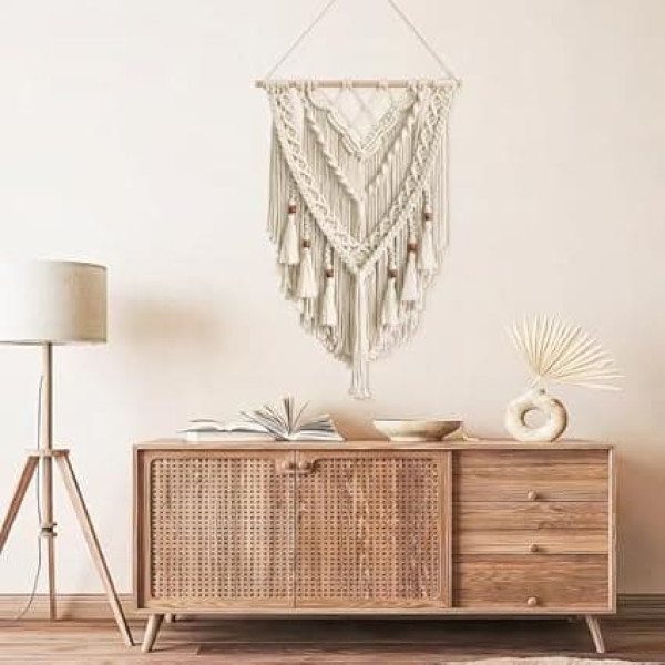 ANAZOZ Boho Macrame Wall Hanging, Wall Decoration Macrame Cotton Woven with Tassels Wooden Beads Wall Tapestry Bohemian for Bedroom Living Room Children's Room 80 x 50 cm Beige