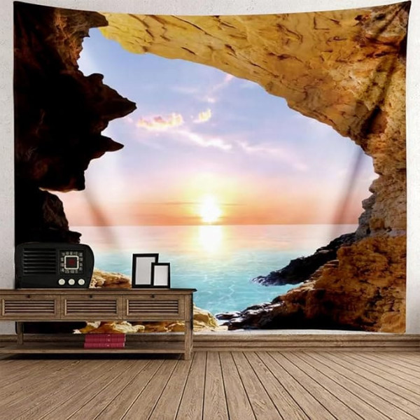 Гобелен Aotiwe XXL 240 см, Гобелен Морское побережье Закат на пляже у пещеры Красочный полиэстер для украшения стен спальни 240 x 220 см