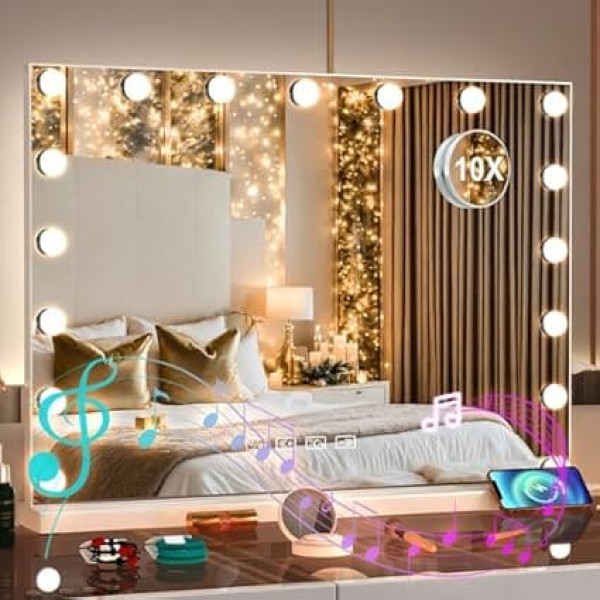 Teousev Зеркало для макияжа с подсветкой, Bluetooth Голливудское зеркало с 17 светодиодными лампочками, затемняемое зеркало для макияжа, 60 x 50 см