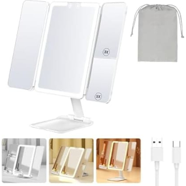 Gospire Зеркало для макияжа с подсветкой, портативное косметическое зеркало с увеличением 1X/3X/5X, тройное складное дорожное зеркало, 3 цвета, ре