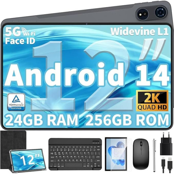 Планшет 12 дюймов Android 14 Tablet, 24 Гб (8+16) RAM + 256 Storage (Expand to 1TB), Android Tablet with Keyboard, Octa-Core, 2K 2000x1200 Display, 16MP Dual Camera, 8000mAh, 5G WiFi, GPS, Bluetooth 5.0