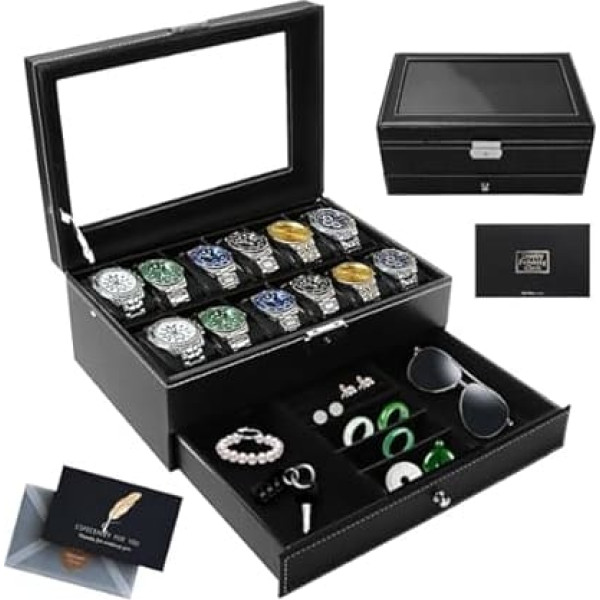 KIMIGO Шкатулка для часов с 2 уровнями, шкатулка для хранения ювелирных часов со стеклянной крышкой, футляр для часов, шкатулка для ювелирных и