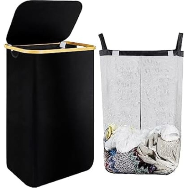 Корзина для белья с крышкой, 105 л, корзина для белья с мешком для стирки, из оксфорда и бамбука, большой ящик для белья с ручкой, черный, выдви