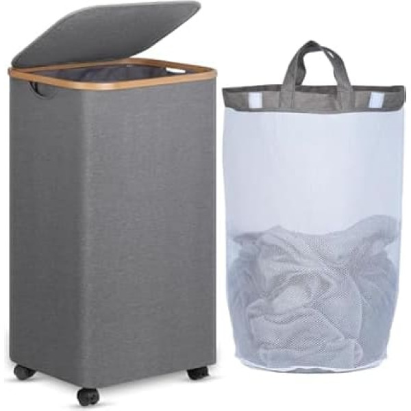 efluky Корзина для белья с колесами 100 л, XL Корзина для белья с крышкой со съемным и моющимся внутренним мешком, серая корзина для белья из бамб