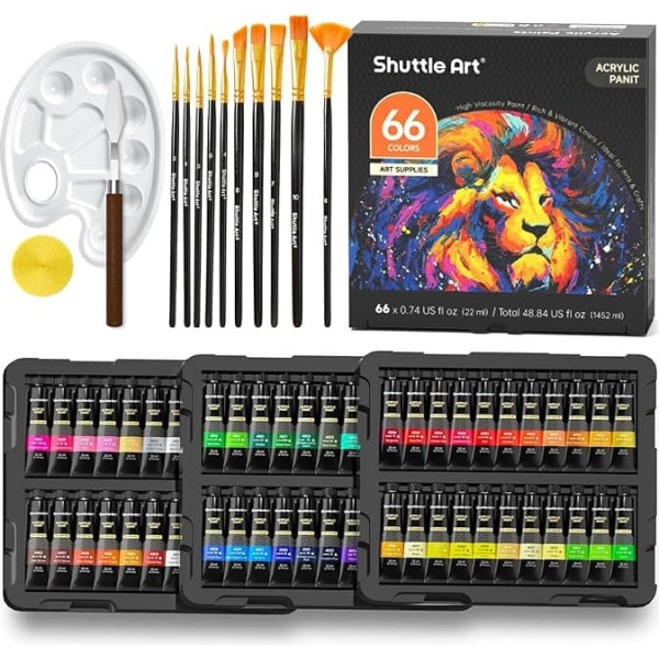 Набор акриловых красок, Shuttle Art 66 цветов 22 мл/тюбик с 3 кистями, профессиональное качество, насыщенные пигменты, нетоксичные для художников,
