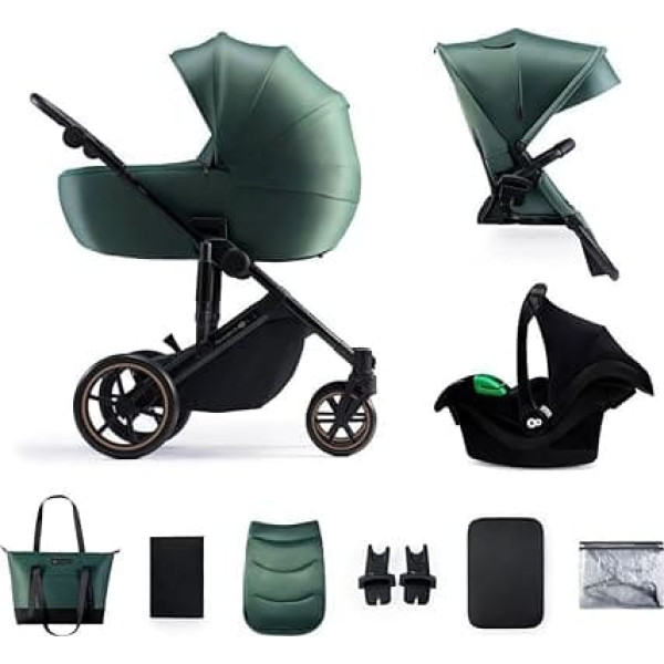Kinderkraft Prime 2 Прогулочная коляска + люлька + защитный чехол для автомобиля Mink Pro, темно-зеленый