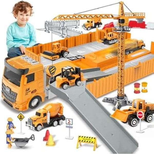 deAO Строительный набор - грузовик, бульдозер, трактор, вилочный погрузчик, миксер, экскаватор, кран и самосвал - отличный подарок