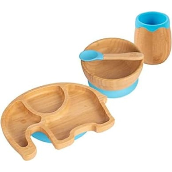 4pc Blue Elephant Bamboo Suction Baby Feeding Set - Toddler Weaning Silicone Stay On Food Bowl Plate Spoon Cup Complete Starter Kit - From Tiny Dining