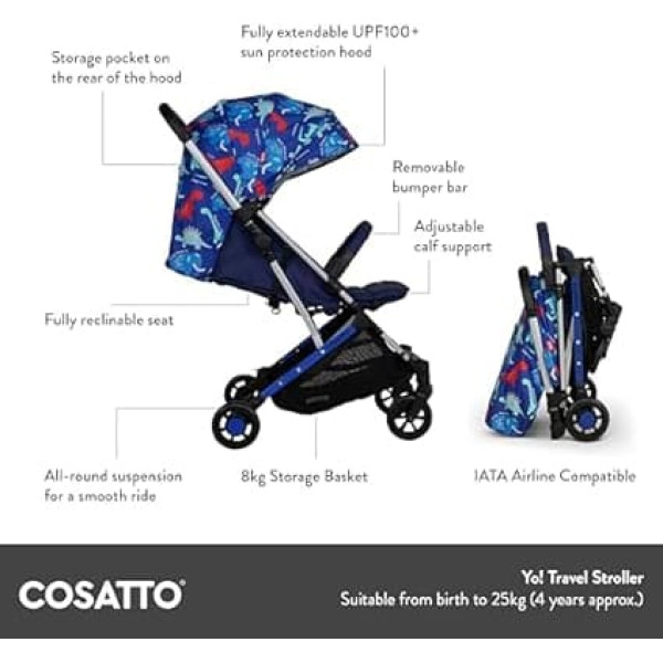 COSATTO Yo Travel Stroller - легкая, компактная, складывается с рождения до 25 кг - безопасна в самолете, легко складывается одной рукой, большая корзина