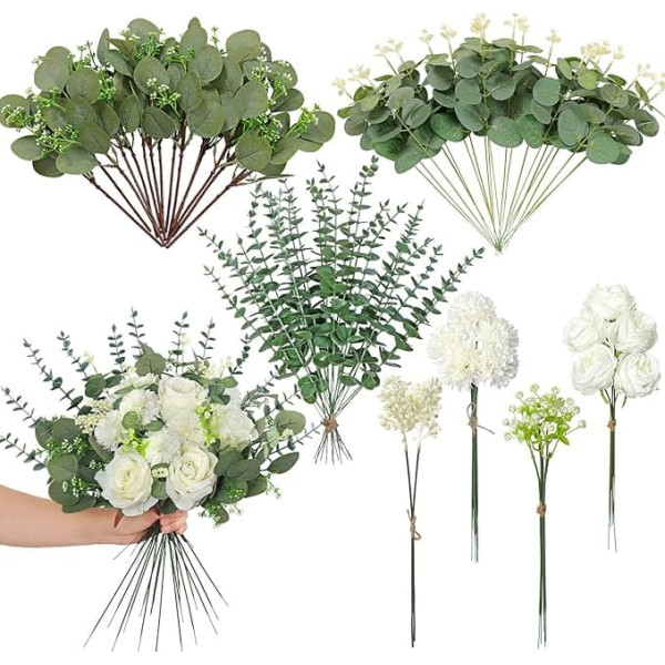 Weldomcor Пакет из 72 искусственных цветов и искусственных ветвей, 7 видов искусственных цветов зеленые листья декоративные ветви, искусственны