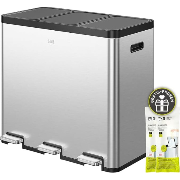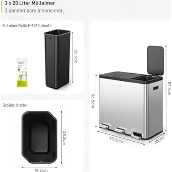 EKO Essential 3-камерный контейнер для мусора, 3 x 20 литров, система разделения отходов, кухонный контейнер с педалью, включает 20 мешков для мусора,