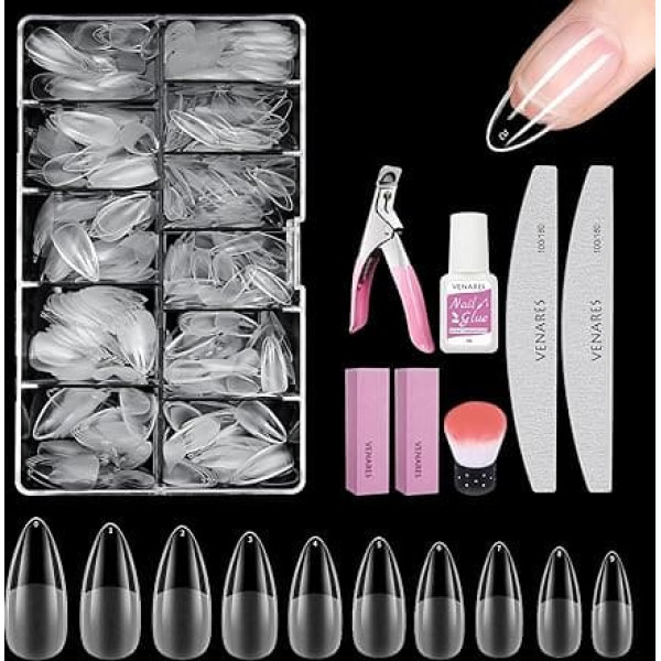 Миндальные короткие наконечники для гелевых ногтей, Venares Pack of 500 Soft Gel Tips Nails 10 Sizes Full Cover Nail Tips Almond Nail Tips Short Almond with Glue Nails Files Nail Buffer Nail Brush Nail Clippers