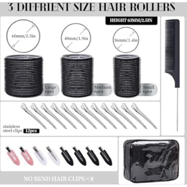PandyCare Набор бигуди для волос, 40 штук бигуди для длинных и коротких волос, бигуди на липучках с 18 самоклеящимися черными бигуди, 16 заколок для