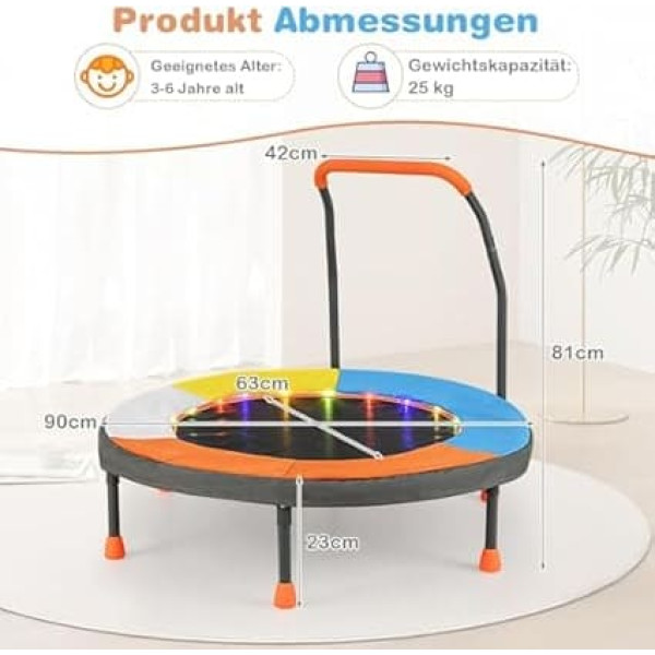 COSTWAY Детский батут Диаметр 90 см Мини-батут складной со светодиодной подсветкой Фитнес-батут крытый с ручкой и сумкой для переноски Маленьк