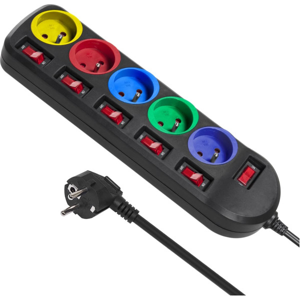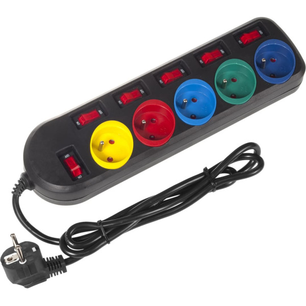 Удлинитель, 5 розеток, с выключателями, многоцветный, 250VAC/10A, 1,5м, MCE204M