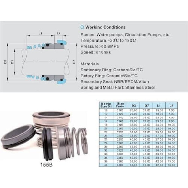RLZQSGOT 155B-22 155A-22 Mechanische Dichtungen Typ 155A 155B BT-FN Welle Größe 22mm for Umwälzpumpen Auto/CER/VIT 5 Teile/los