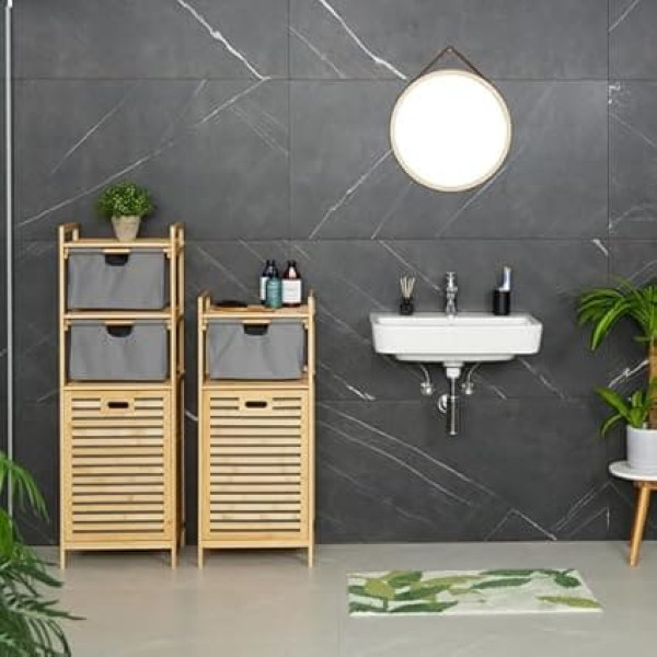 Корзина для белья Relaxdays, опрокидывающаяся, 30 литров, полка и ящик, бамбук, ткань, В x Ш x Г: 95 x 40 x 33 см, натуральный/серый