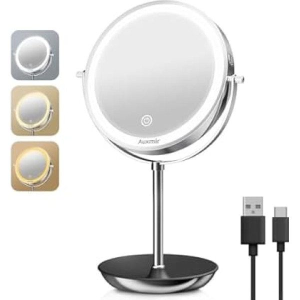 Аккумуляторное зеркало для макияжа Auxmir с LED-подсветкой и увеличением 1X/20X, 8-дюймовое зеркало для макияжа с подсветкой, 3 цвета подсветки с во