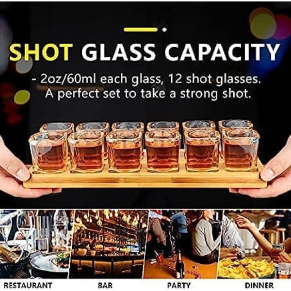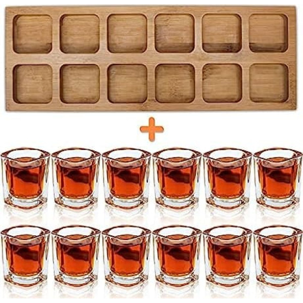 Suprobarware Shot Glass Set 60ml Cocktail Holder and Shot Glass Drinks Serving Board Organizer 12 Holes with Clear Crystal Glass 12 Pieces for Liquor Shooting Whisky Brandy