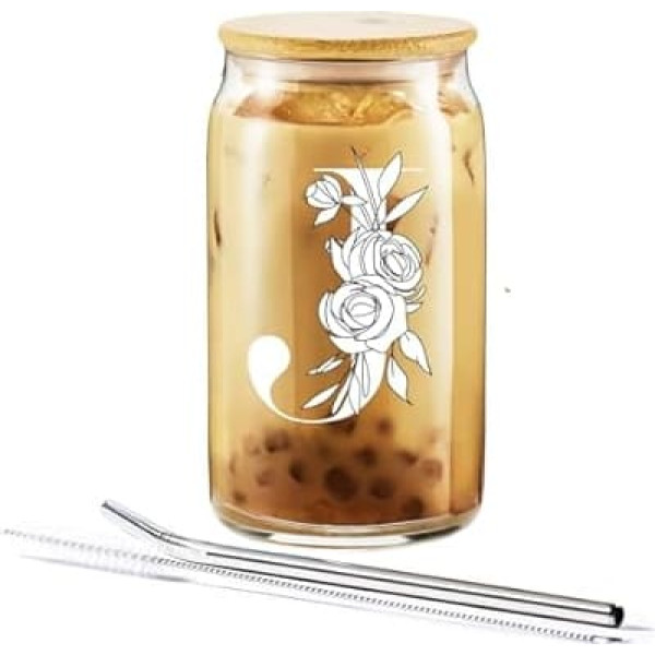 HAYOOU Glasbecher mit Initiale, monogrammiert, Geschenke für Damen und Herren, Geburtstag, Valentinstag, Muttertag, Weihnachten, 473 ml, Glasbecher mit Strohhalm-Deckel, Eiskaffeetassen J