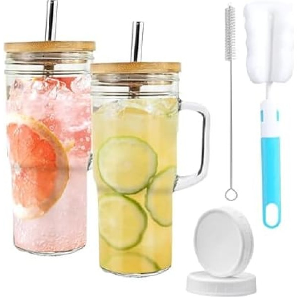 YUANYE Glasbecher mit Deckel und Trinkhalmen, 680 ml, ideal für Eiskaffee und Bier, Fruchtwasser, Tee und Kaffee, 2 Stück